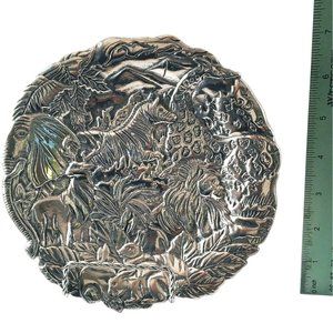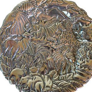 Vintage Wild Animal African Wildlife Decorative Metal Plaque Plate 3D Embossed Art 7.5" by TWN Perfect 1991 Beautiful 3-Dimensional collector plate with Elephant, Zebra, Lion, Giraffe, Rabbits, Deer, plus trees and plants.