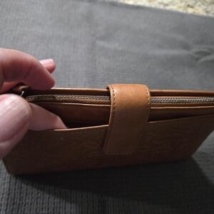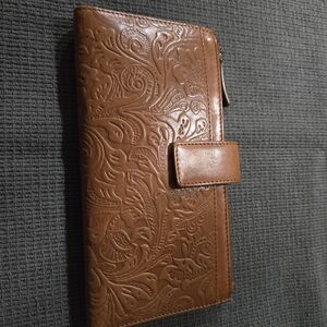 Elegant brown wallet with intricate embossed design. Perfect for everyday use.