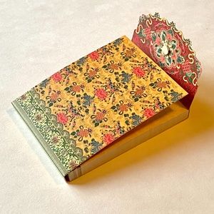 Small notepad with decorative, magnetic cover. Textured with embossed filigree and die-cut edge. Beautiful outer pattern and on notepad too.