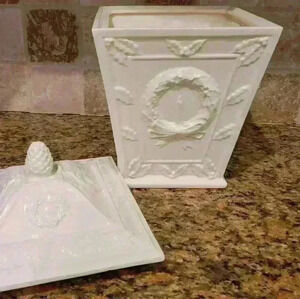 Elegant Cookie/Biscotti Container with embossed Holiday motifs surrounding it. Features Holly, Santa, Wreath, Christmas Tree and Bells with a Pinecone finial.