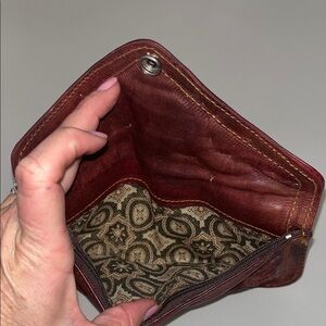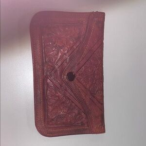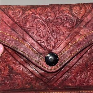Beautiful embossed leather wallet in rich brown. Elegant and stylish design. OS. Smoke and pet free home. Some holes from embellishments that were removed. Beads that were sharp. Snap closure, with some rub off of black paint as pictured. 2 interior pockets, 1 that zips closed. Appears to be handmade. Measurements in pictures
