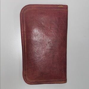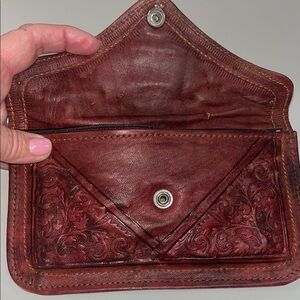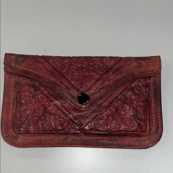 Beautiful embossed leather wallet in rich brown. Elegant and stylish design. OS. Smoke and pet free home. Some holes from embellishments that were removed. Beads that were sharp. Snap closure, with some rub off of black paint as pictured. 2 interior pockets, 1 that zips closed. Appears to be handmade. Measurements in pictures