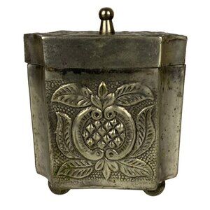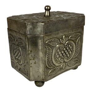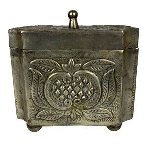 Embossed Metal Lidded Trinket Box Silver Floral Decorative Organization Patina
