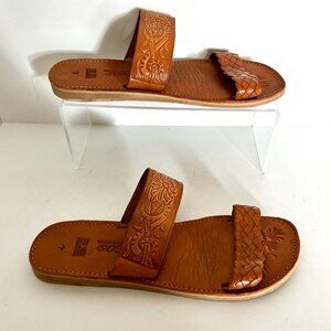Embossed Mexican Slip on Sandals Size 7 Flats Genuine Leather Open Toe Women's
