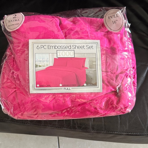 Experience comfort with our embossed pink sheet set. This 6-piece set includes extra pillowcases for added convenience. Easy care and wrinkle-free for a perfect night's sleep.