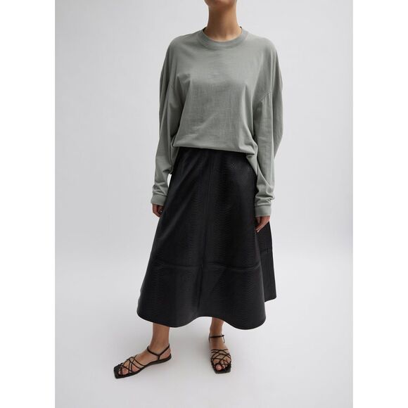 This Tibi embossed leather circle skirt is new with tags, with the tag cut off but included. It has been professionally cleaned by a leather specialist and is ready for wear without direct heat or steam damage, ensuring longevity and quality care for the leather material.