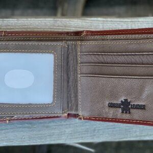 This wallet is made of high quality genuine leather. Wallet features six card slots, with an dual sided ID window. Three bill compartments one has a zippered closure. Wallet has three slide slots two inside and one outside on the back.