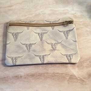 Stylish clutch with embossed skull pattern. Features a zipper closure. Perfect for a chic look.
