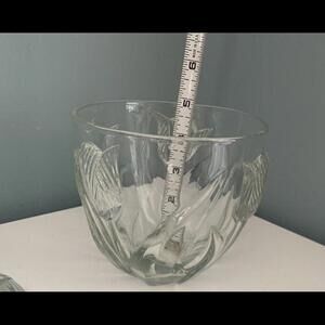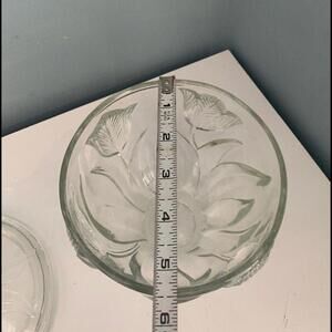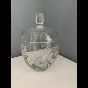 The candy dish is vintage and original, with a production style that is cut glass. It has a lid included and is perfect for storing candies, biscuits, or any other small items. The item diameter is 5.5 inches, and the item depth is 4 6/8 inches. The dish is unmarked, and the model is a lid. The theme is tulips, and the color is clear. This candy dish is a great addition to any collection and is sure to impress.