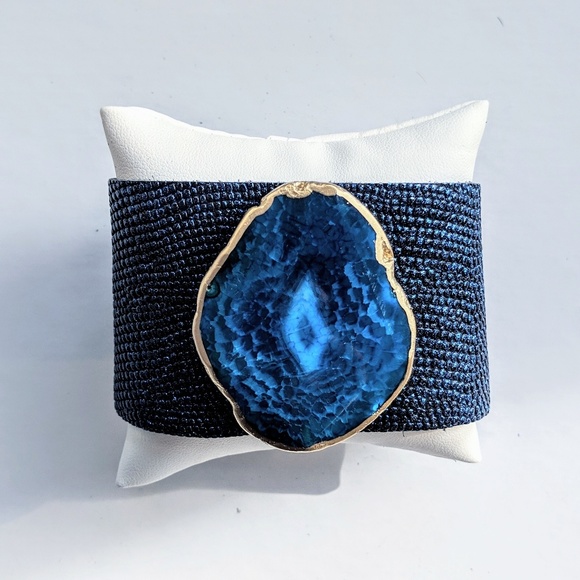 Dark blue cuff with hand painted Brazilian agate stone