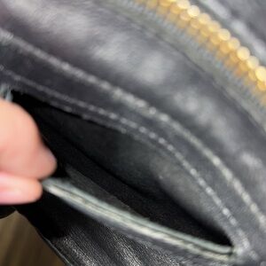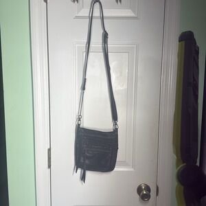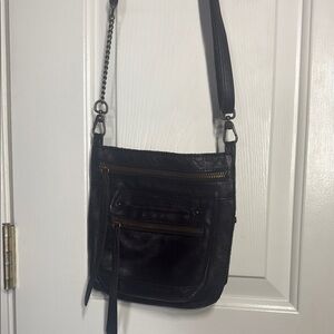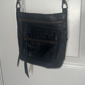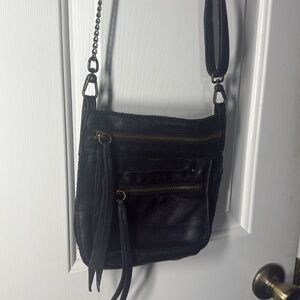 Sleek and stylish black leather crossbody bag, perfect for any occasion.Soft Leather Features a durable design with convenient zippered pockets. GUC
