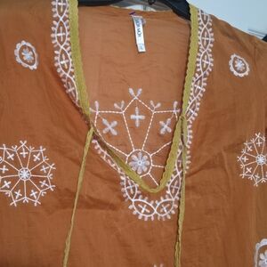 Beautiful burnt orange terracotta color, flowy, light weight, 100% cotton shirt with contrasting stitched designs in white embroidery designs with gold colored ties