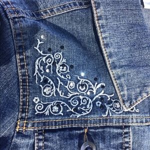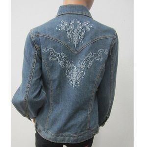 Tantrums Embroidered Denim Jean Jacket with Jeweled buttons front Adjustable buttons at waist for perfect fit Embroidery & bead decoration 2 Front Chest Pockets 79% Cotton 20% Polyester 1% Spandex