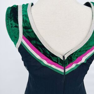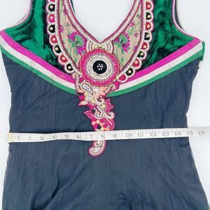 This dress features a striking multicolored embellished design, perfect for a wedding guest or cocktail occasion.