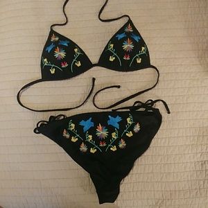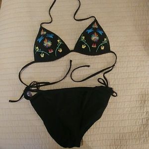 This is the perfect bikini for someone who loves fun details. Both the top and bottom piece contain cute, eye catching embroidery, and look brand new with no loose thread or worn looking material. The top (size L) contains light padding, and the bottom (size XL) can be adjusted by strings. For a woman with more curves, these bottoms actually provide great coverage and will not feel too revealing. The bottoms are plain black in front and embroidered on the back.