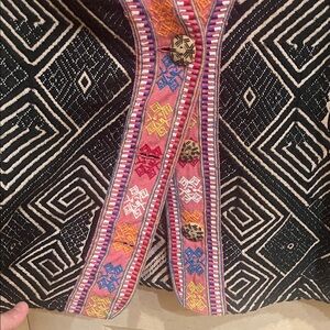 Embroidered vest with geometric patterns. Features pink and black embroidery. Ideal for a chic layered look.