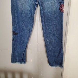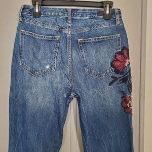 Stylish blue jeans featuring elegant floral embroidery and a distressed finish. Perfect for a chic, casual look.