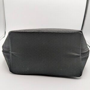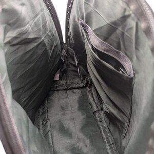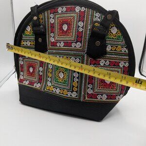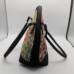 Bohemian-style embroidered handbag in black with green, red, and gold detailing. Features two handles, zipper closure, and a small inside zip side pocket. Measures approximately 12" wide by 9" tall. Pre-owned in excellent condition.