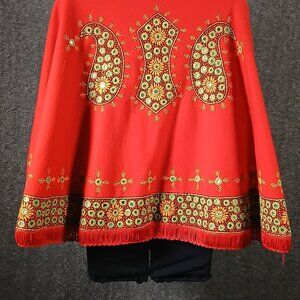 Turn every entrance into a moment. This vivid red statement jacket features intricate embroidered motifs accented with reflective mirror work, finished with dramatic fringe trim at the hem and sleeves. The bold paisley inspired panels and stand collar give it a vintage bohemian, folkloric feel that reads festival, stage, and gallery opening all at once.