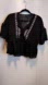 Black top with button detail at the chest. Below the chest and down is sheer as well as the back. It has flowy sleeves. Swiss dot details. This would look awesome with high waisted pants and ankle booties. Make work appropriate by wearing a cami underneath. This is sexy without being too sexy.