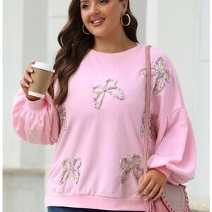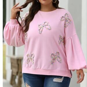 Light Pink Embroidered Bow Lantern Sleeve Oversized Pullover Sweatshirt Kawaii