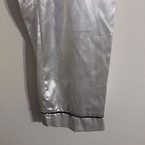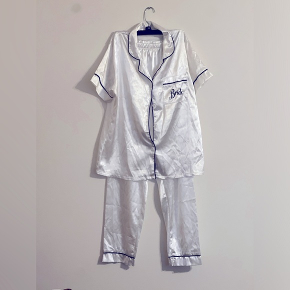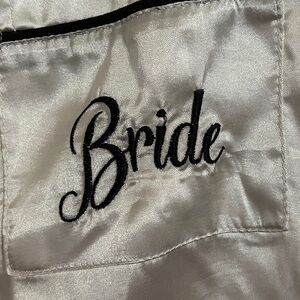 White, black trim satin pajamas, Bride embroidered in black, two piece set