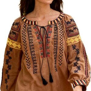 This Peasant blouse has navy, red and yellow embroidery on a coco brown background. Loose fitting and comfortable it is made from linen and can be hand washed or cold water machine wash. It measures: Bust 43", Sleeve 20", Length 23" and Shoulder 20 1/2" . The embroidered neck line has a tassel tie in navy. The sleeves are puffed 3/4 length with buttons on the embroidered cuffs. Stylish addition to wear with jeans or skirt, the rich colors are perfect for your wardrobe.