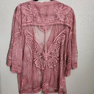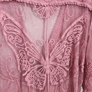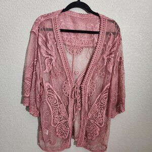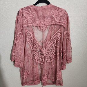 Embroidered Butterfly Cardigan Womens One Size Pink Sheer Kimono Lace Tie Front