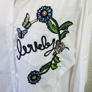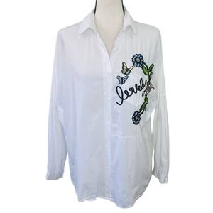 Embroidered Button Down Boxy Top Womens L White Floral Lovely Boho Art to Wear