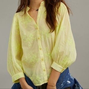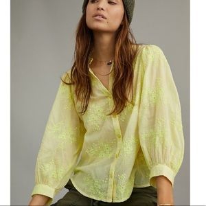 New with tags, The Bella Femme Buttondown. Featuring au courant puffed sleeves and an elegantly embroidered finish, this SOLD OUT top puts a feminine twist on the classic buttondown silhouette. Condition: NWT, retails $98 Color: Chartreuse, Lime Green Cotton Embroidered detail Balloon sleeves Approx: 26”