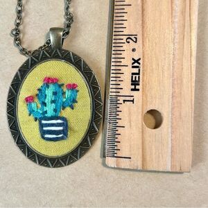 Add a touch of nature to your wardrobe with this charming embroidered cactus pendant. Featuring vibrant colors on a light green background, it's a perfect accent piece. Set in a bronze-toned pendant on an 18” chain.