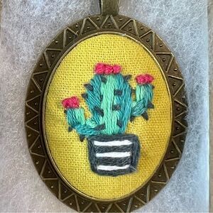 Embroidered Cactus Pendant with Light Green Background - handmade