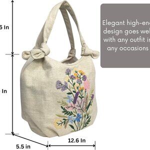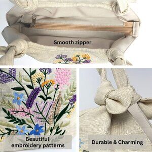 Embroidered Canvas Tote Bag Small Shoulder Handbag with Zipper for Women