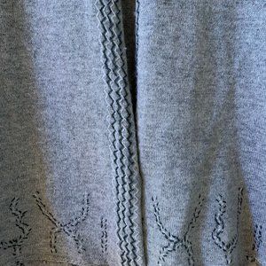 A soft, lightweight cardigan with a small clasp at the neck line, and some embroidery along the garment.