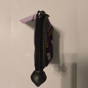 Colorful embroidered mini coin purse/pouch featuring a bold boho-inspired geometric pattern in purple, green, yellow, and black. Compact size makes it perfect for coins.