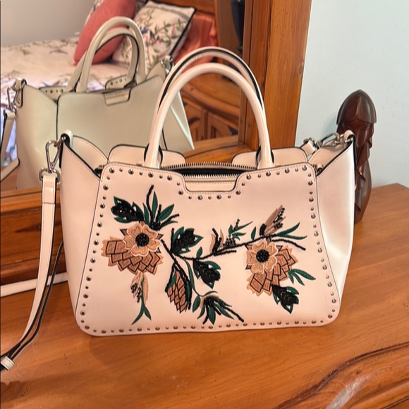 Elegant cream handbag with floral embroidery. Perfect for adding a touch of sophistication to any outfit.