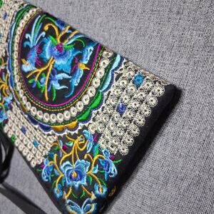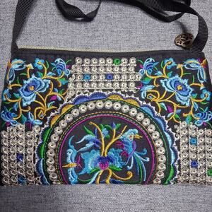 Embroidered Cross Body Purse Multi Color Lotus Flower Boho gold Tone Zipper