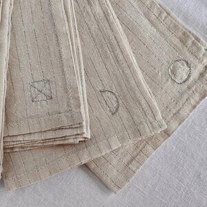 Beautiful set of linen napkins with metallic silver lurex stripe design and custom embroidered shapes at corners... never used.