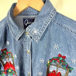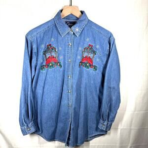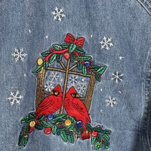 Embroidered Denim Button Down Sz S Cardinal Holiday Winter Grannycore Christmas