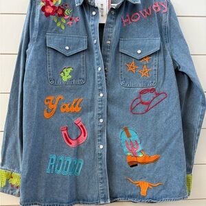 Chic denim button-up shirt featuring colorful embroidery. Ideal for adding a playful touch to your casual wardrobe.