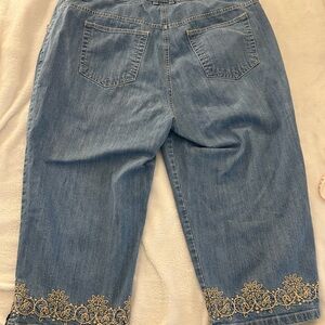 Stylish denim capris with intricate embroidery at the hem. Perfect for casual outings.