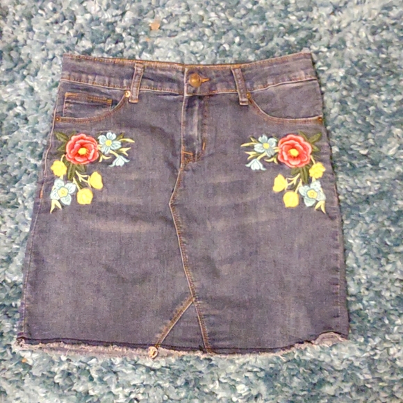 Adorable jean skirt with embroidered flowers. Lightweight and great for summer.