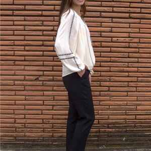 Cream boho-style blouse with black embroidered detailing and a tasseled tie neckline. Flowy, lightweight fabric with long sleeves for an effortlessly chic look.