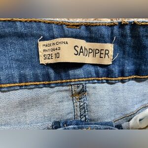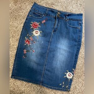 Stylish and versatile Sandpiper embroidered denim skirt.