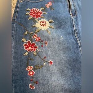 • Design: Distressed denim with bold floral embroidery in red, white, and green