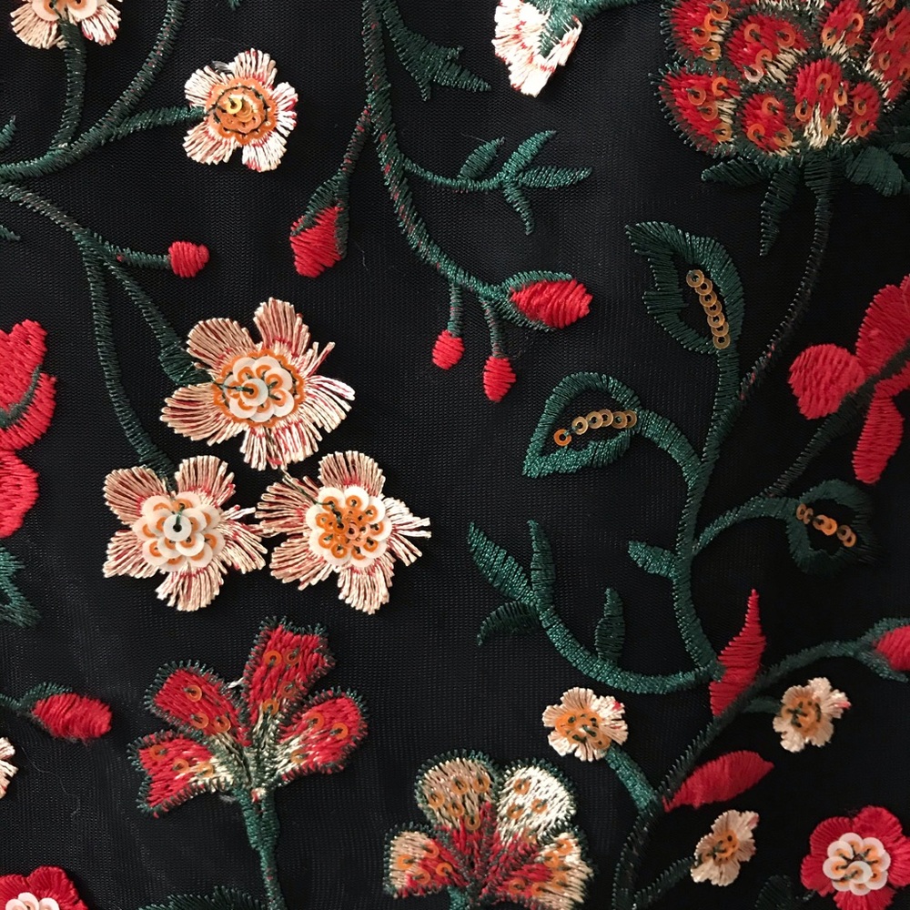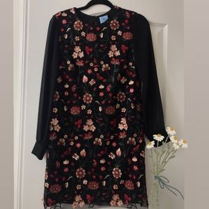 The CeCe™ Enchanted Wildflower Knit Dress embodies contemporary elegance with an allover floral print, sheer black sleeves, and loose flattering fit.