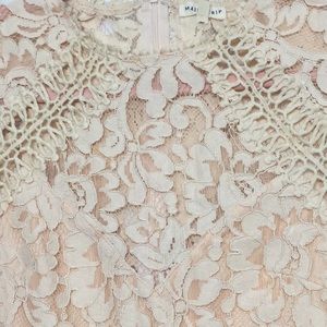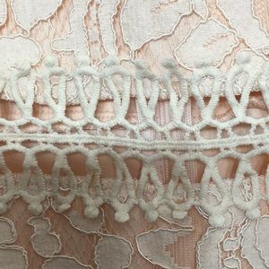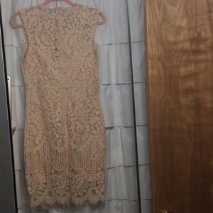Embroidered Dress. Peachy nude color. Crochet details and peekaboo areas of skin. This hits me at my knees (I’m 5’6”). Tried on, never worn.