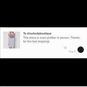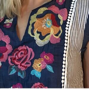 Beautiful dress with delicate embroidered flowers. Denim Blue Striped with cap sleeves. Fully Lined. Great quality and material breathes nicely.