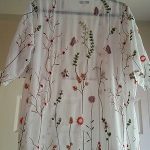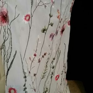 *White semi transparent material with a floral embroidery design, white, green, reds, orange, pink, blue, brown, multi color