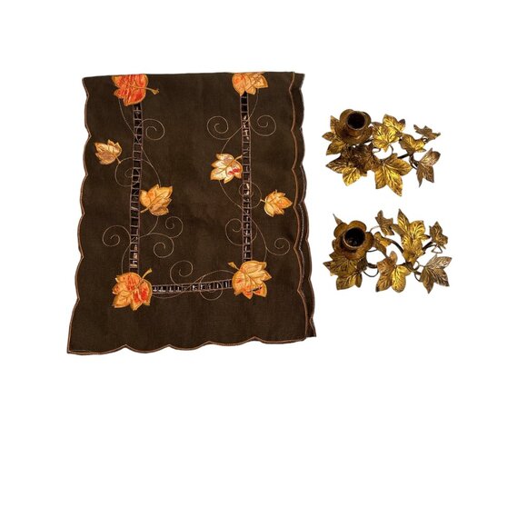 Embroidered Fall Table Runner & Gold Leaf Candle Holders Set